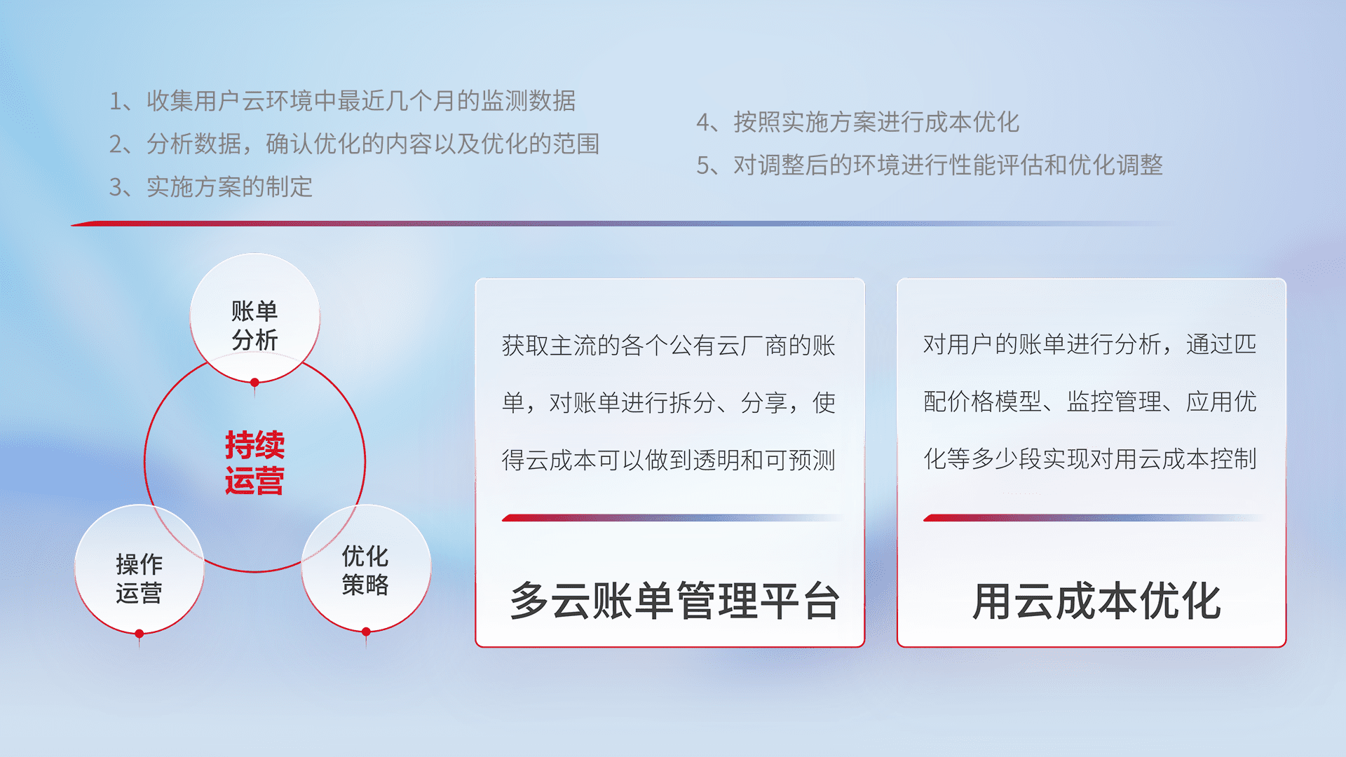 通过多云纳管,,,,以统一的资源数据模型把客户的云资源进行抽象和封装,,,进而实现对多云资源的统一操作,,保障云资源管理的可靠性、、、稳定性与可用性。。。量身定制化运维内容,,,配置、、开发运维、、、补丁管理、、备份、、、、监控、、、认证和访问管理、、、、审计和日常巡检等,,保障在用云过程中的可靠度,,,稳定度以及高可用率。。