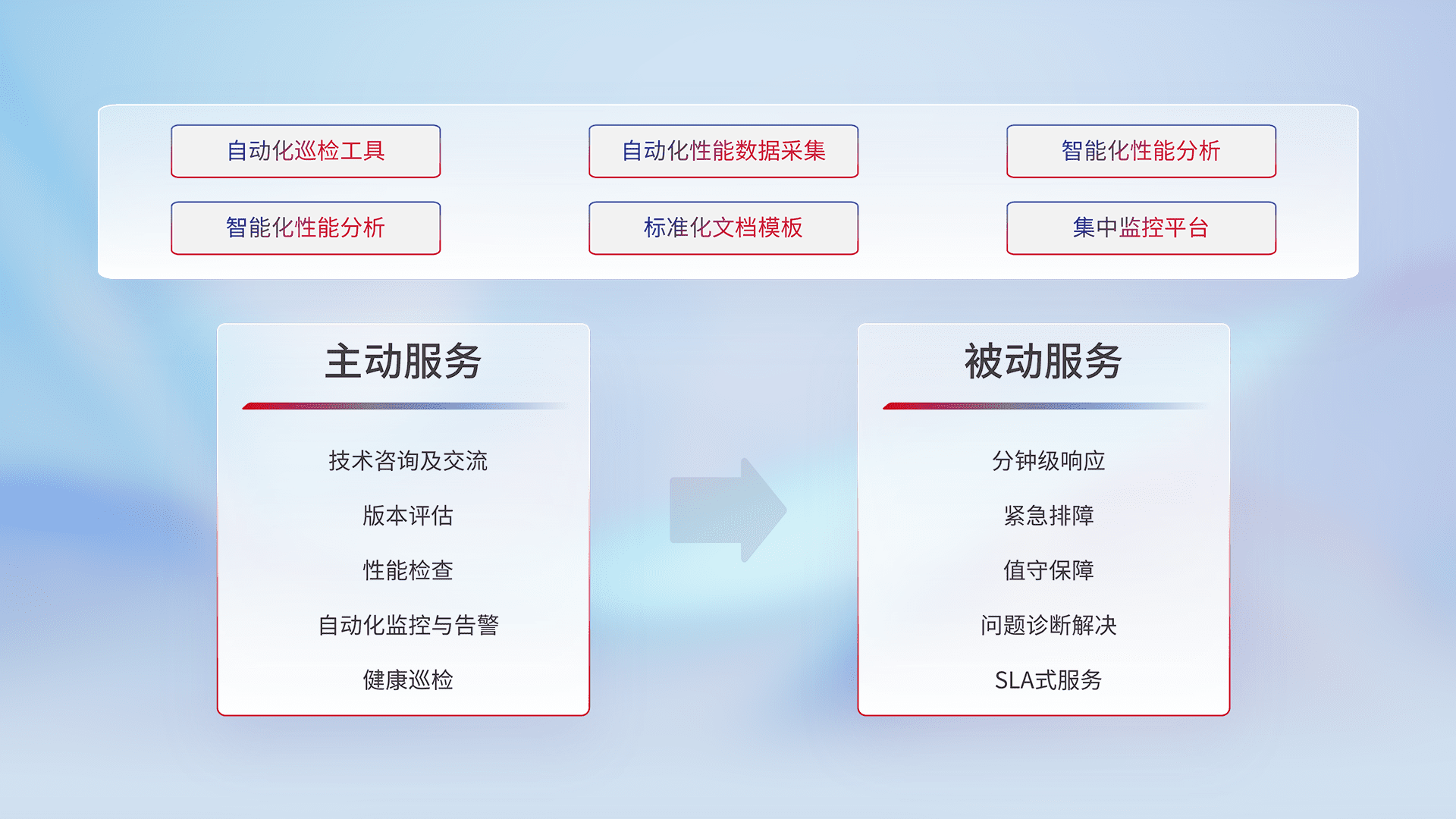 智能化工具和标准化文档,,,,保障服务质量,,,,提供主动服务(包含技术咨询、、、、版本评估、、性能检查、、、自动化监控与告警、、健康巡检)和被动服务包含(分钟级响应、、、、紧急排障、、、值守保障、、问题诊断解决、、、SLA服务)。。。。